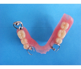 一般的な保険適用の入れ歯です。ピンクの土台に人工歯、金属の針金で、残存歯に引っ掛けるような構造です
